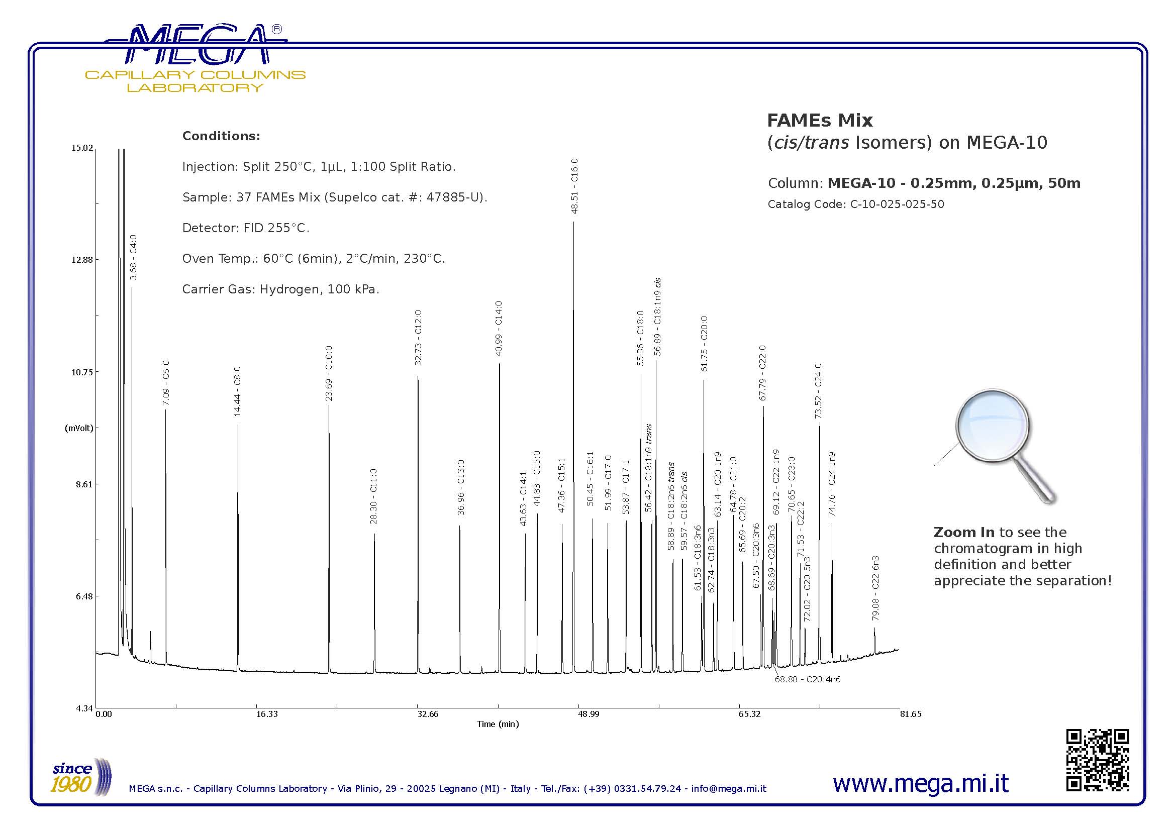 1,以50米長度的MEGA-10石英毛細(xì)管柱分離37種脂肪酸甲酯,效果可以媲美其它品牌50米長度的產(chǎn)品,不僅縮短了分離時(shí) 間,而且大大降低了產(chǎn)品成本。
