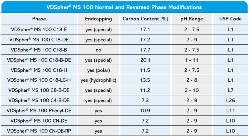 其它LC-MS/MS色譜柱包括:VDSpher MS C8-B-DE、VDSpher MS C4-B-DE、VDSpher MS Phenyl-DE、VDSpher MS CN-DE、VDSpher MS CN-DE-RP。