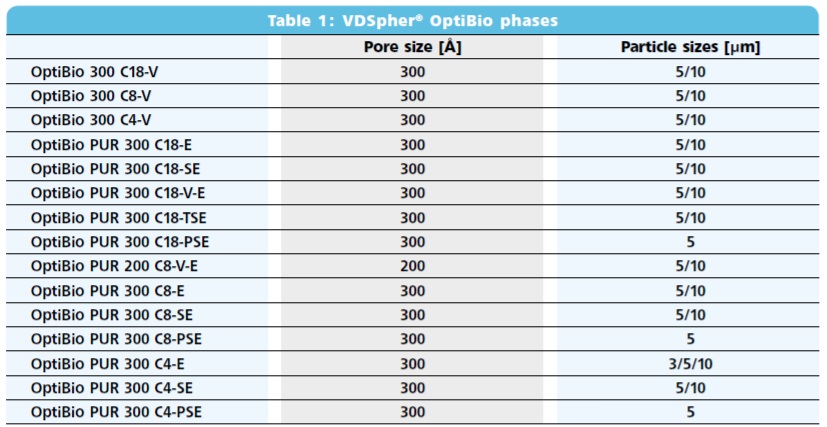 德國VDS Optilab色譜技術(shù)公司是具有31年開發(fā)和生產(chǎn)液相色譜柱經(jīng)驗的企業(yè),VDSpher OptiBio系列生物分離液相色譜柱是運用反相液相色譜分離生物大分子化合物,產(chǎn)品品種和優(yōu)化的選擇更全面,達到和超越世界領(lǐng)先的Vydac公司同類產(chǎn)品。