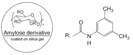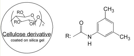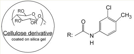 纖維素型是使用最廣泛的手性柱之一,纖維素型手性色譜柱的分離作用包括相互吸引的作用及形成包埋復(fù)合物。它們屬于Wainer分類(lèi)中的第2種類(lèi)型。市售的手性色譜柱為微晶三醋酸基、三安息香酸基、三苯基氨基酸鹽纖維素固定相。很多化合物可通過(guò)此類(lèi)型的色譜柱得到分離。這種類(lèi)型的手性色譜柱種類(lèi)也很齊全。流動(dòng)相使用低極性溶劑,典型的流動(dòng)相為異丙醇-正己烷混合物。這類(lèi)柱子根據(jù)制作工藝,分為涂敷與鍵合兩大類(lèi)。但特別要注意由于氯可以使涂敷纖維素從硅膠上脫落,因此要確保涂敷類(lèi)柱子流動(dòng)相中無(wú)含氯溶劑。